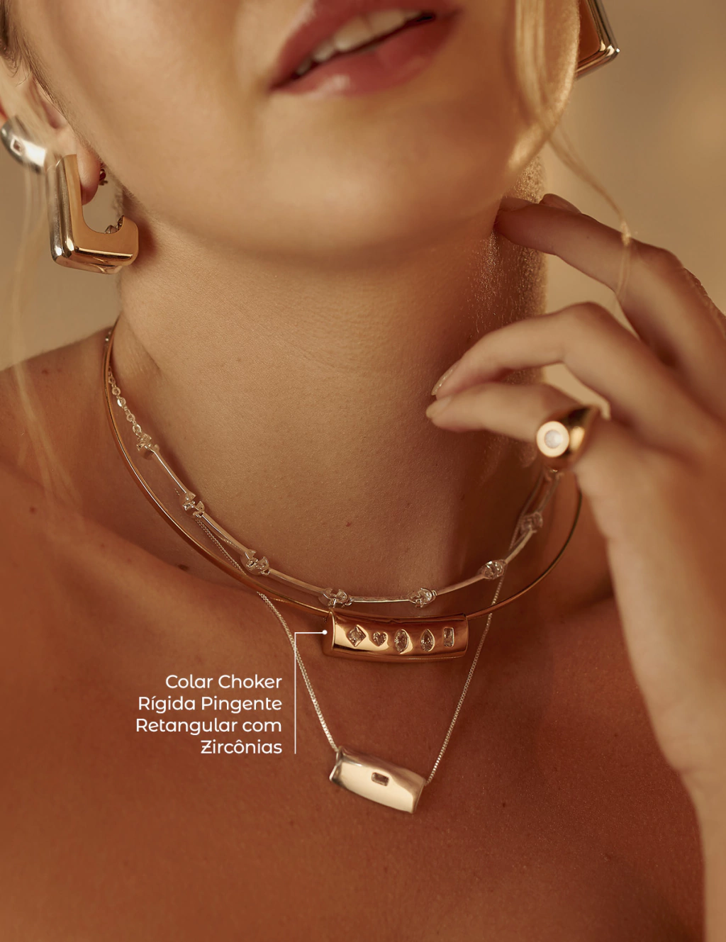 - Colar Choker Rígida com Pingente Retangular com Zircônia;